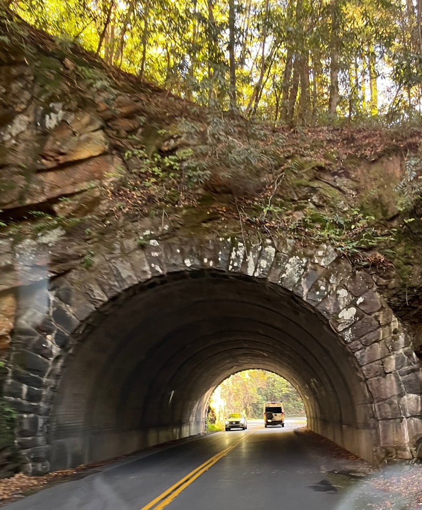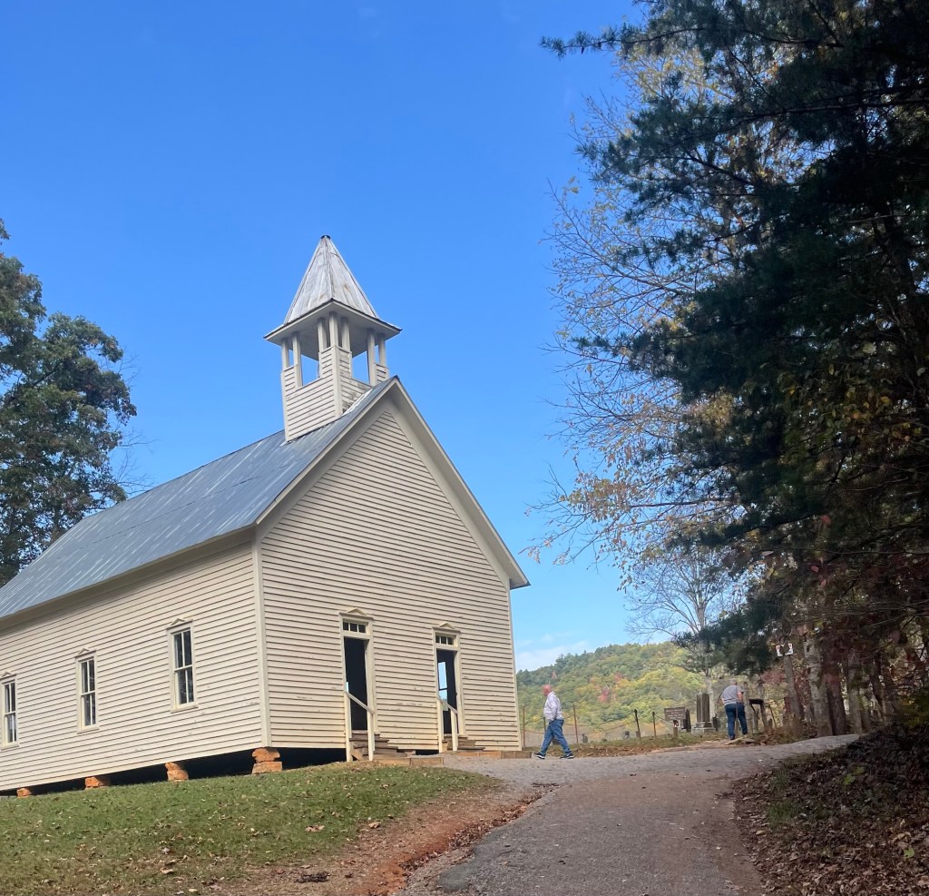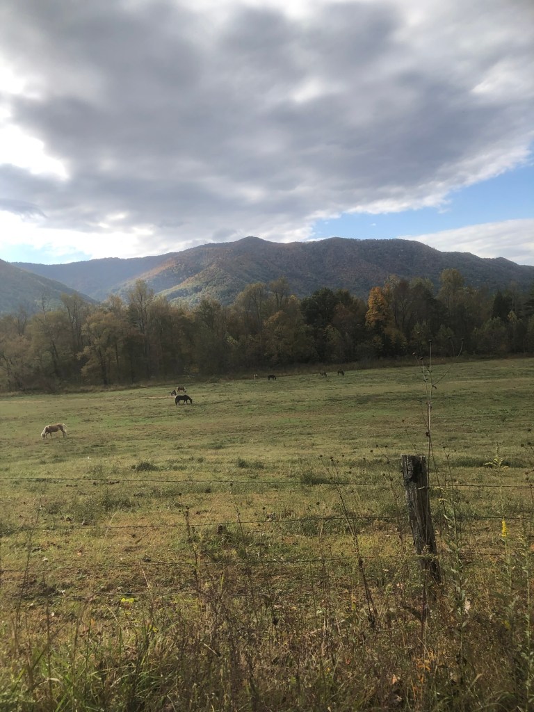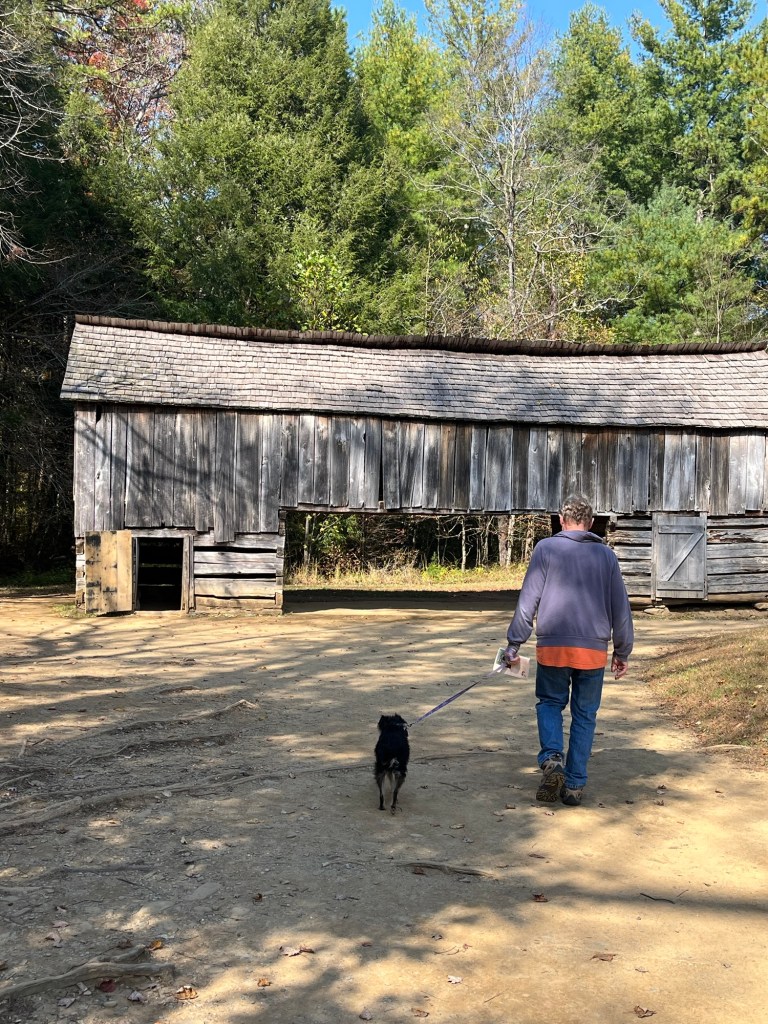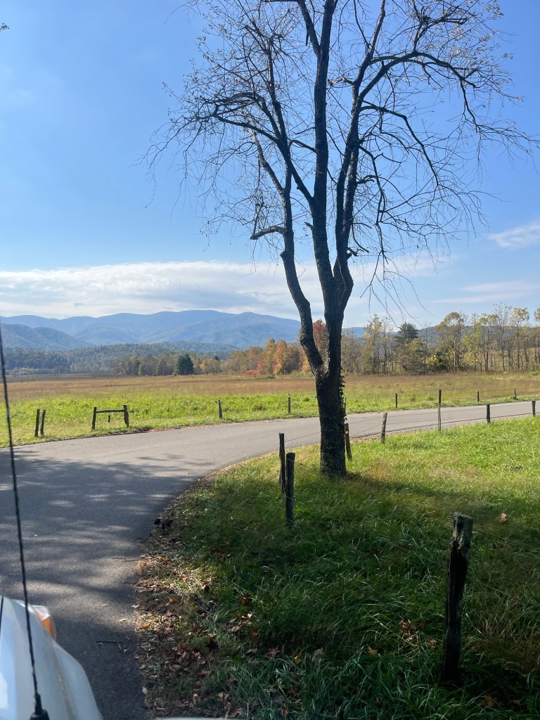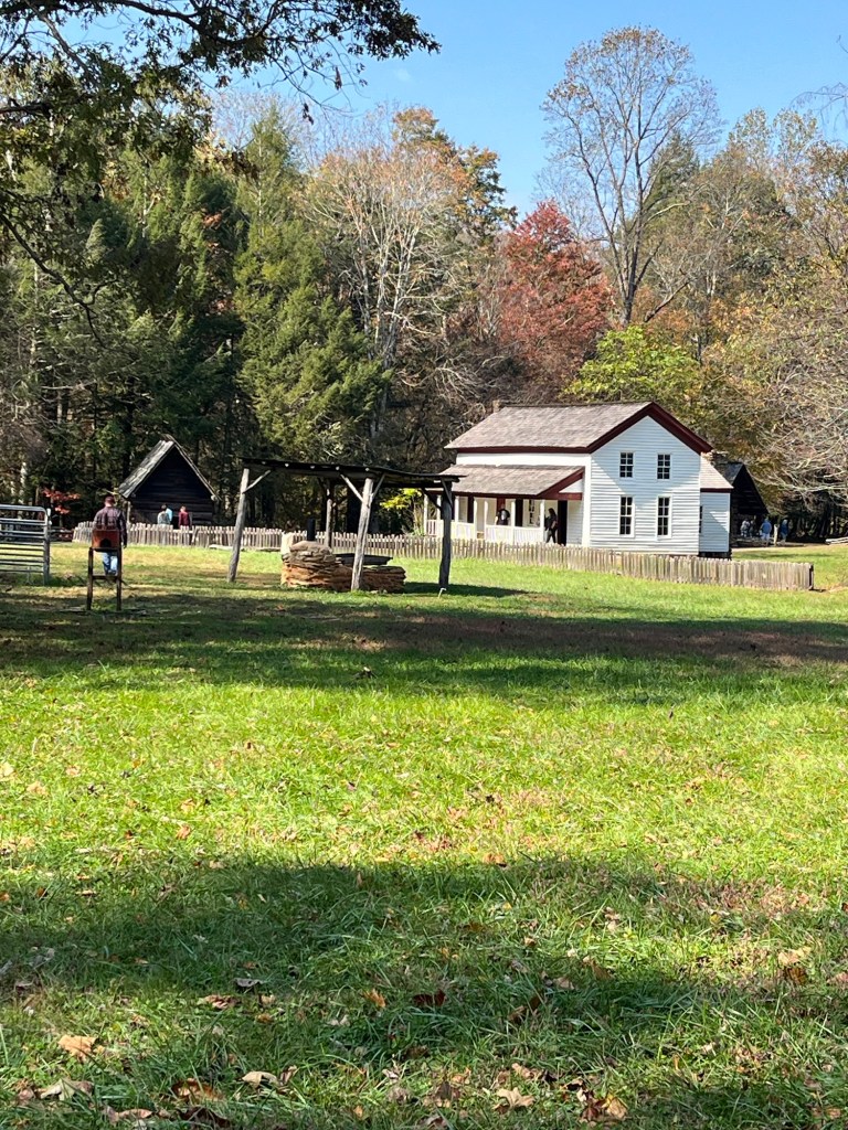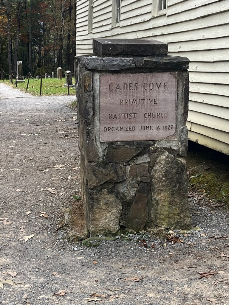 We are in Cade’s Cove campground, which is very nice. A “cove” is a flat space between mountains or ridges. Cade’s Cove was home to about 125 families in the mid 1800s and there are houses, churches, and farms from that period. We, plus many other cars, drove the Cade’s Cove loop today to see the historic sites. Much of it was slow bumper-to-bumper going. We felt like we were on Disney’s Jungle Cruise ride, but the slow pace allowed us to enjoy and appreciate the park’s beauty.