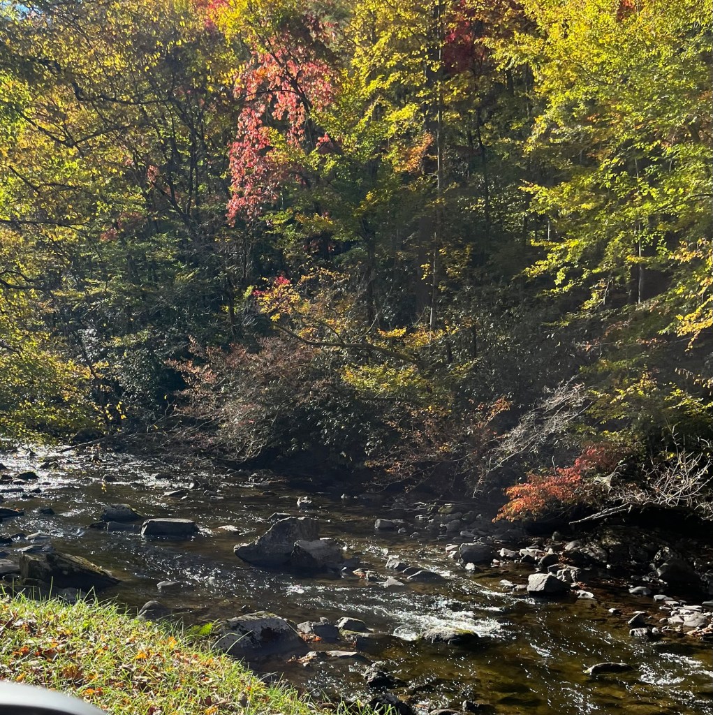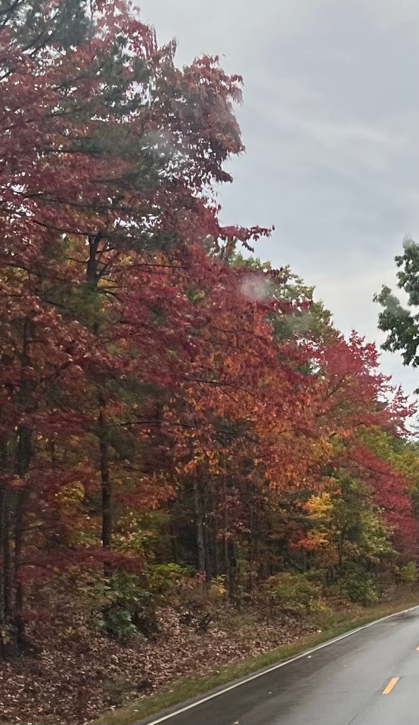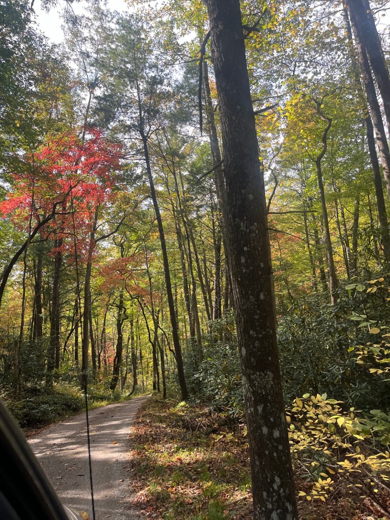 Mr. “I have to drive remote, obscure roads” Reilly had us on a bumpy dirt road through the forest. No traffic 😂 and the fall colors were spectacular.