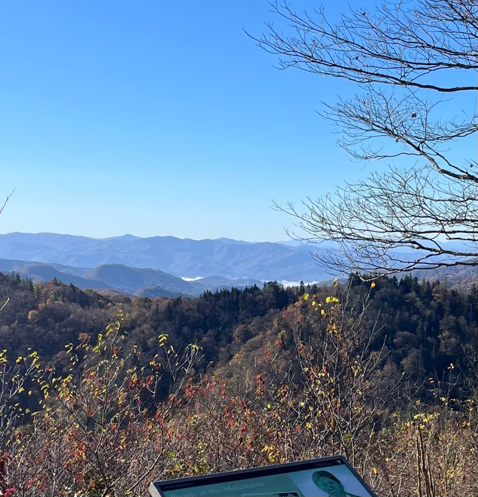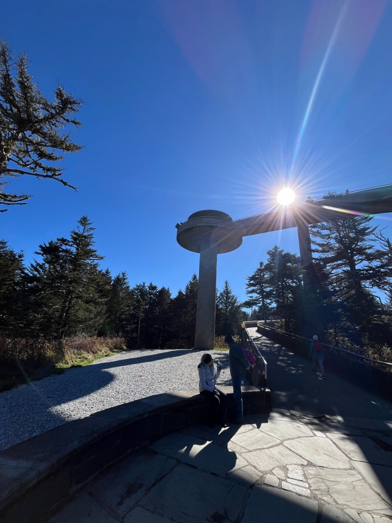 We spent the morning exploring more of the Great Smoky Mountain Natl Park on our way out to North Carolina. We took a short half mile hike up to the top of Clingman’s Dome at 6,653 feet above sea level—the highest mountain in the Smokies. Because it straddles the boundary line between two states, it is the highest peak in Tennessee and North Carolina. It is also the highest point of the Appalachia Trail.
